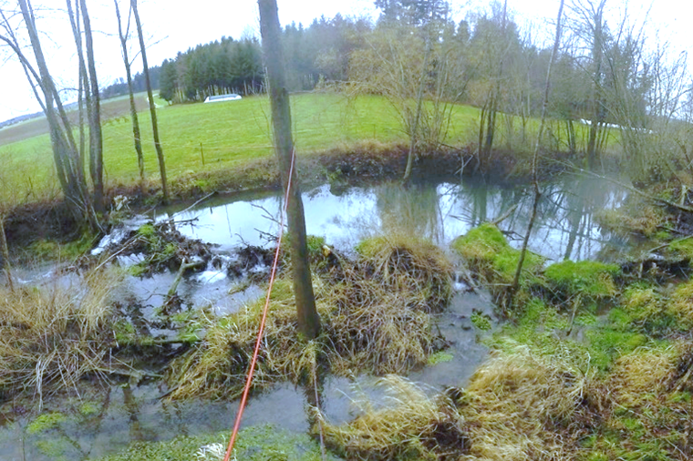 Auch die Bachforelle kann also von der Rückkehr des Bibers profitieren. Eine häufige Frage insbesondere im Hinblick auf die Zukunft ist auch der Einfluss des Bibers auf die Wassertemperatur und den Wasserrückhalt. Während die Messungen der Temperaturen in den Staubereichen der Biberdämme in den drei untersuchten Schweizer Bächen im Sommer kühlere Temperaturen feststellen konnten, waren die unterhalb liegenden Strecken nicht beeinflusst. Viele Faktoren wie Beschattung, Geologie, Boden, Verweildauer des Wassers im Biberteich, Austausch zwischen Bachwasser und Grundwasser und anschliessendem Rückfluss in den Bach über den Boden spielen hier herein (Minnig et al., 2024). Geeignete Biberteiche können damit unter Umständen als Kälterefugien im Sommer dienen. Unterschiedliche Studien machen hierzu allerdings uneinheitliche Aussagen, weshalb der Einfluss auf die Wassertemperatur wohl standortabhängig ist (Rosell et al., 2005). In Zukunft dürften weiter sowohl schnelle Hochwasserspitzen als auch Trockenperioden häufiger werden (Hydro CH-2018). Die Biberdämme helfen hierbei erwiesenermassen beim Wasserrückhalt und können dabei auch Hochwasserspitzen puffern. Dies kommt auch den Fischen zugute, wie zum Beispiel positive Resultate vom Schlossbach in Rümligen (BE) aus der Praxis zeigen (Minnig et al., 2022; Minnig et al., 2025).