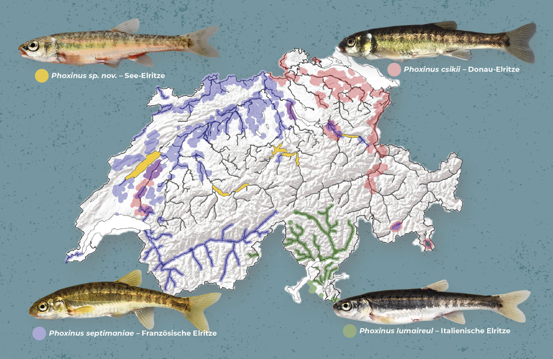Abb. 1: Die Verbreitungsgebiete der Elritzen in der Schweiz. Dr. Bárbara Calegali.